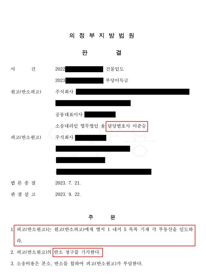 원고를 대리하여 피고를 상대로 건물인도를 구했던 사건입니다.