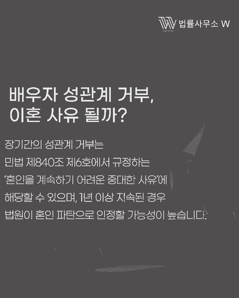 많은 분들이 폭력·외도 등 명확한 잘못이 있어야만 재판상 이혼이 가능하다고 생각하지만, 배우자의 장기간 성관계 거부 역시 혼인 파탄 사유로 인정될 수 있습니다. 오늘은 그 법적 근거와 실제 소송 시 입증 방법을 알려드리겠습니다.