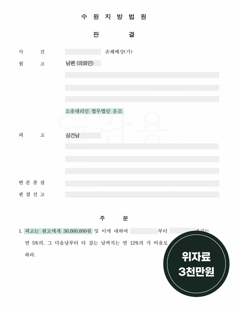 추가적으로 의뢰인이 정신과 치료를 받은 기록도 제출하여 정신적 고통의 정도를 실질적으로 증명할 수 있었습니다. 결과적으로 법원은 피고의 고의성과 불륜을 인정하며 1,500만 원의 손해배상금 지급을 명령하였습니다.