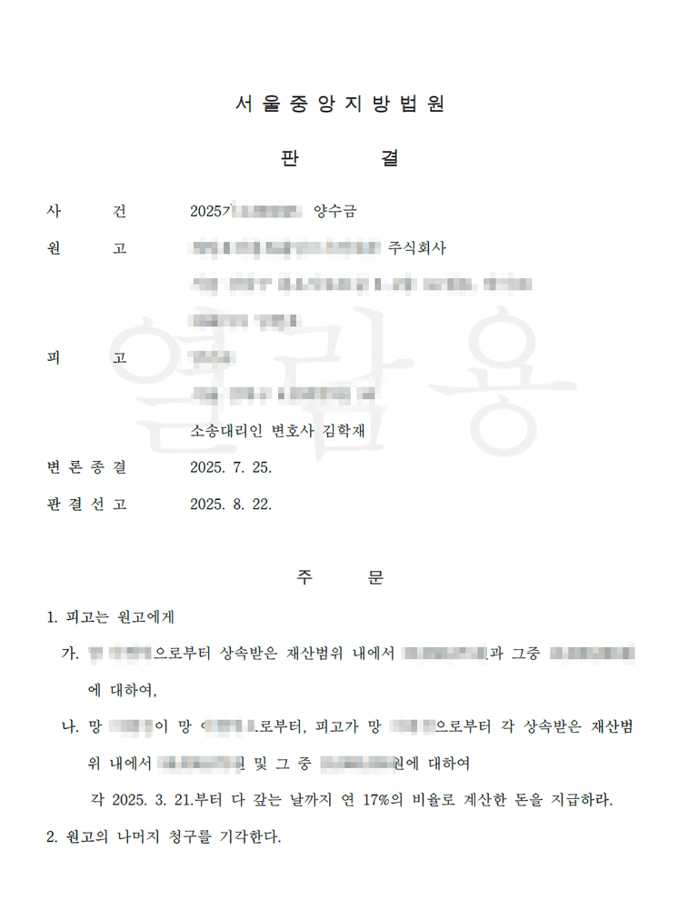 [전부승소]2025년 8월 22일 양수금 소송 전부승소