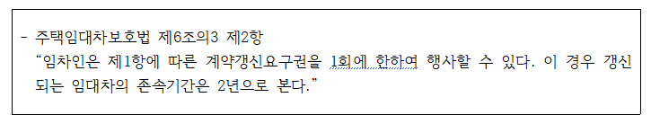 흔히 계약갱신요구권이 4년 간의 주거를 보장하는 권리라고 받아들이는 듯 합니다. 계약갱신요구권은 기존 임대차계약 존속기간과 무관하게 1회에 한해 추가적으로 2년의 임대차 존속기간을 보장하는 권리입니다.