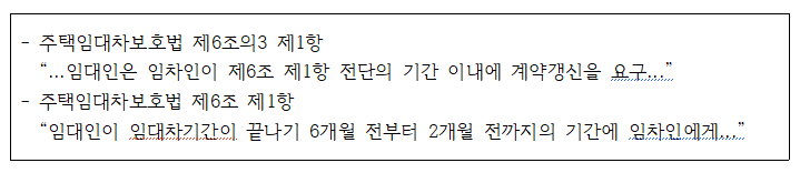 임차인은 임대차기간이 끝나기 6개월 전부터 2개월 전까지의 기간내에 임대인에게 계약갱신요구를 해야 합니다.