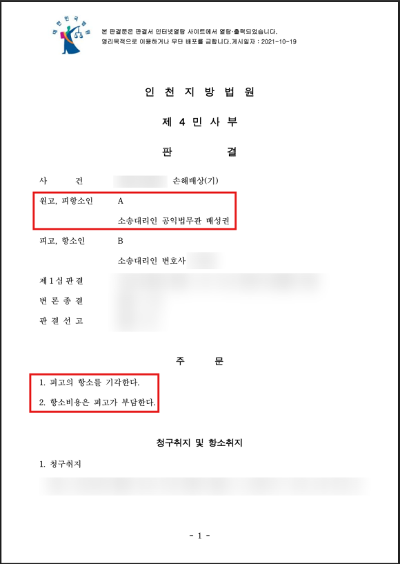이상과 같은 주장을 받아주신 법원은, 의뢰인의 청구를 인용하여주셨을 뿐만 아니라 상대방(피고) 측의 항소를 기각하여 주셨습니다.