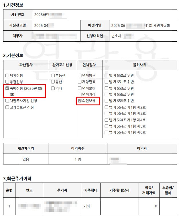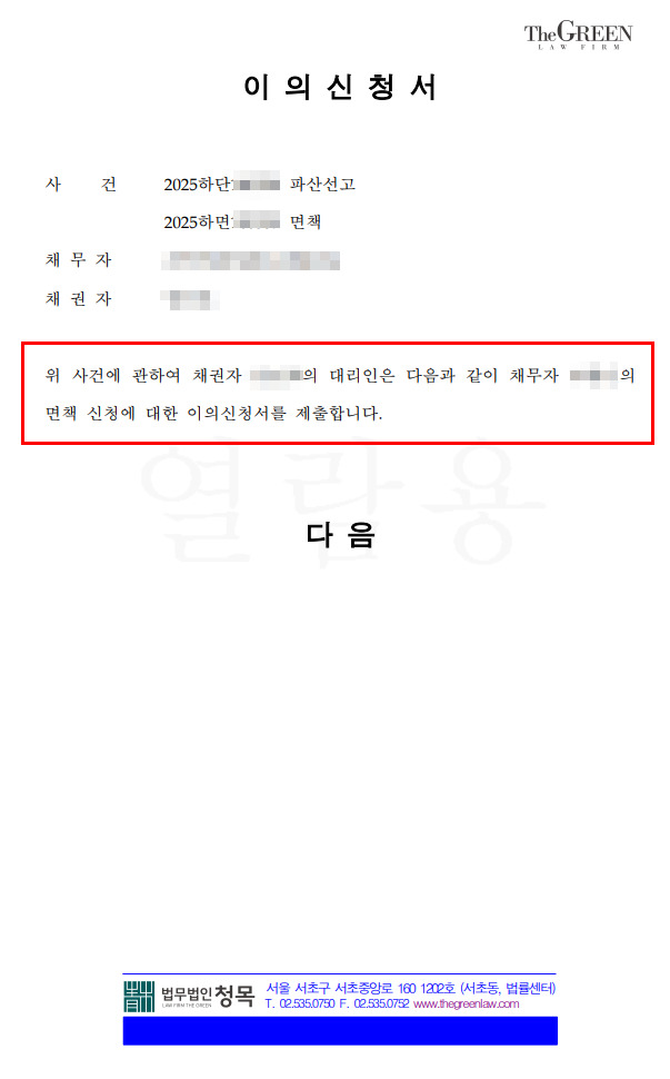 채권자집회일이 얼마 남아 있지 않았으므로, 신속하게 준비하여 면책 이의 신청서를 제출하였다.