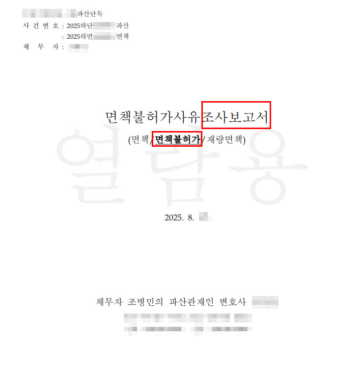 우리 사무실에서 제출한 서면 및 증거자료를 기반으로 채무자에 대한 면밀한 조사가 이루어진 결과, 파산관재인은 "면책 불허가" 의견을 내었다.