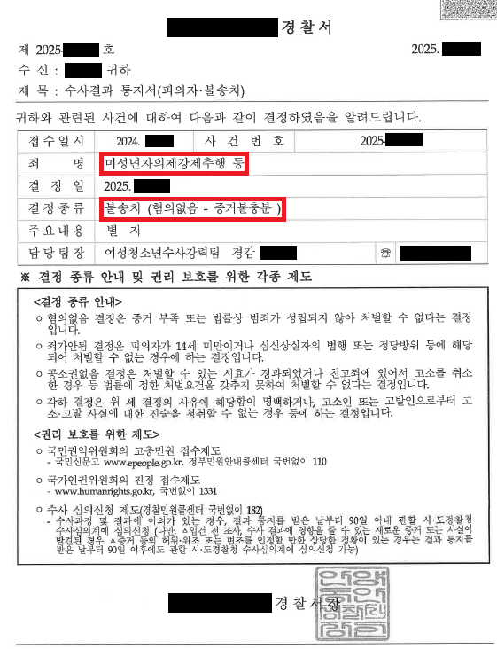 최종적으로 경찰은 변호인의 주장을 대부분 받아들여, 강제추행 혐의를 인정할 증거가 불충분하다고 판단하여 '혐의없음(증거불충분)'으로 불송치 결정을 내렸습니다. 이로써 의뢰인은 하루아침에 성범죄 전과자가 될 뻔한 억울한 위기에서 벗어나 소중한 직장과 일상으로 복귀할 수 있었습니다.