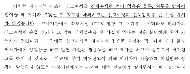 허위 신고 동기 제시 : 상대방은 의뢰인에게 귀가 택시비를 요구했으나 거절당했습니다. 저는 이 점에 착안하여, "신고여성이 귀가할 택시비가 없자 의뢰인에게 앙갚음을 하고 경찰차를 이용해 귀가하려는 의도로 허위 신고를 했을 가능성"을 수사기관에 적극적으로 주장했습니다.