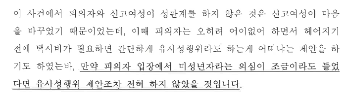 고의와 반대되는 행동 : 만약 조금이라도 상대방이 미성년자라는 의심이 들었다면, 의뢰인은 과거의 경험에 비추어 즉시 만남을 중단하고 자리를 피했을 것입니다. 그럼에도 불구하고 물티슈를 사러 가는 등 만남을 이어가려 했던 행동 자체가 미성년자임을 전혀 인식하지 못했다는 강력한 증거임을 논리적으로 주장했습니다.
