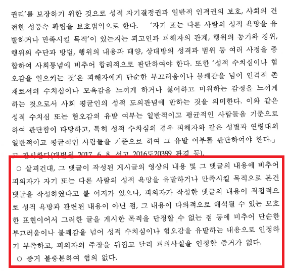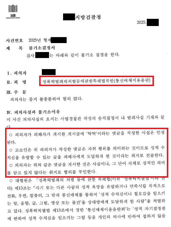 검찰은 변호인의 주장을 받아들여, '탁탁'이라는 댓글의 내용이 다의적으로 해석될 수 있는 모호한 표현이어서 성적 수치심이나 혐오감을 유발하는 내용으로 인정하기 부족하고, 피의사실을 인정할 증거가 없다고 판단하였습니다.