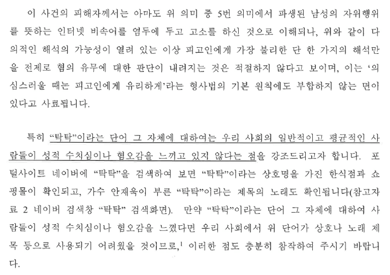 다음으로, '사회 평균인의 성적 도의관념'에 반하지 않음을 증명했습니다. 주장을 뒷받침하기 위해, '탁탁'이라는 단어가 실제 우리 사회에서 어떻게 사용되는지 구체적인 자료를 수집하여 제출했습니다. 포털사이트 검색 결과를 증거로, '탁탁'이라는 상호의 식당과 쇼핑몰, 심지어 가수 안재욱의 노래 제목으로도 사용되는 점을 보여주며 , 이는 ‘일반적이고 평균적인 사람들’이 이 단어에서 성적 수치심을 느끼지 않는다는 강력한 방증임을 강조했습니다.
