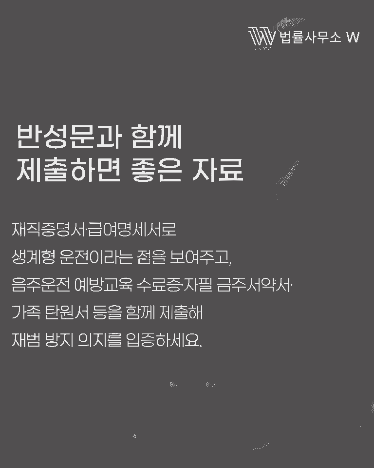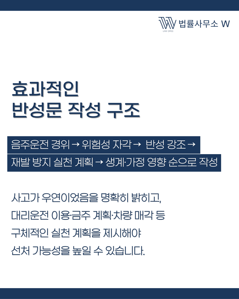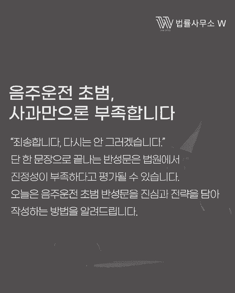 따라서 반성문은 단순한 사과문이 아니라 양형자료로서 역할을 제대로 해야 합니다. 재판부가 ‘이 사람은 다시는 음주운전을 하지 않겠구나’라는 확신을 가질 수 있도록 설득력 있게 작성하는 것이 핵심입니다.