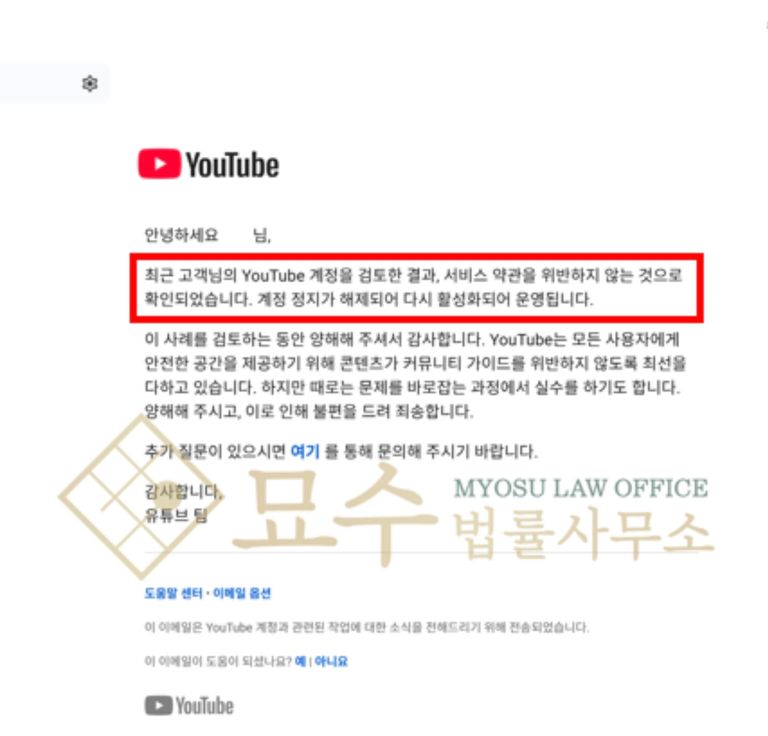 의뢰인이 홀로 계정 복구를 요청했을 때에는 이의 신청이 받아들여지지 않았으나, 안형서 변호사의 조력 이후 유튜브에서 안형서 변호사의 주장을 받아들여 계정이 다시 복구될 수 있었습니다.