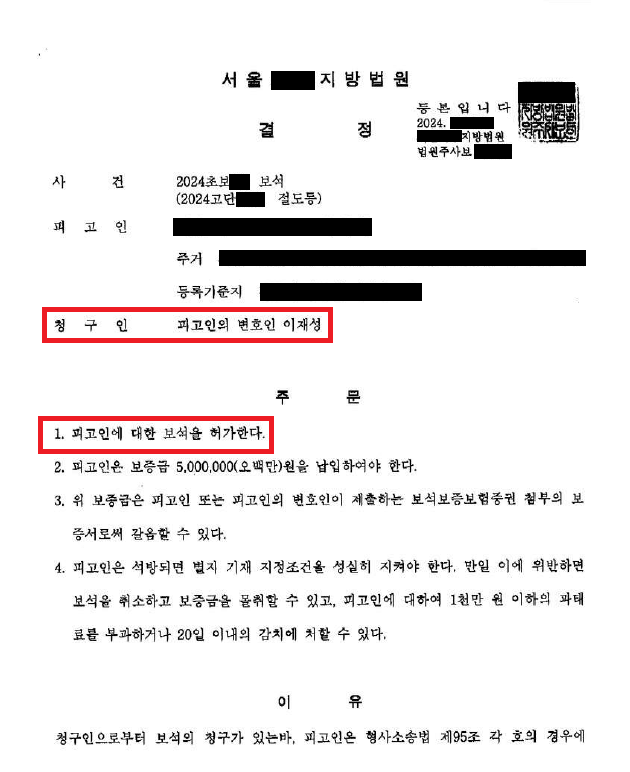 해당 재판부는 저의 주장을 면밀히 검토한 끝에, 보석허가청구서를 제출한 지 불과 하루 만에 보석을 허가하는 결정을 내렸습니다. 보석보증금을 납입한 의뢰인은 구치소에서 나와 가족의 품으로 돌아갈 수 있었고, 불구속 상태에서 남은 항소심 재판을 차분히 준비할 수 있게 되었습니다.