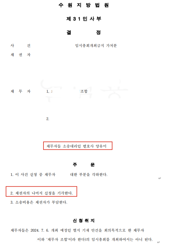 ⚖️ 이에 대하여 법원은, 아래와 같은 이유로 채권자의 조합을 상대로 한 임시총회개최금지 가처분신청을 기각하였습니다.