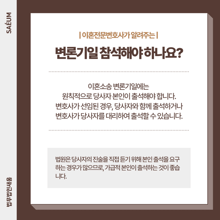 오늘은 이와 관련해 이혼소송 변론기일에 직접 출석이 도움이 되는지 설명해 드리고자 합니다.