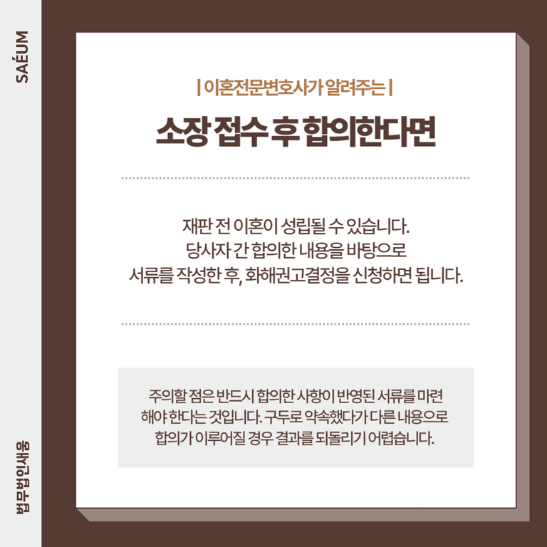 간혹 소장을 접수해 절차를 진행하다가 상대방과 합의되는 경우도 있습니다. 예컨대 처음에는 남편과 의견대립이 예상되어 소장을 접수했는데, 곧바로 조율이 되어 합의로 마무리할 수 있다면 어떻게 해야 할까요?