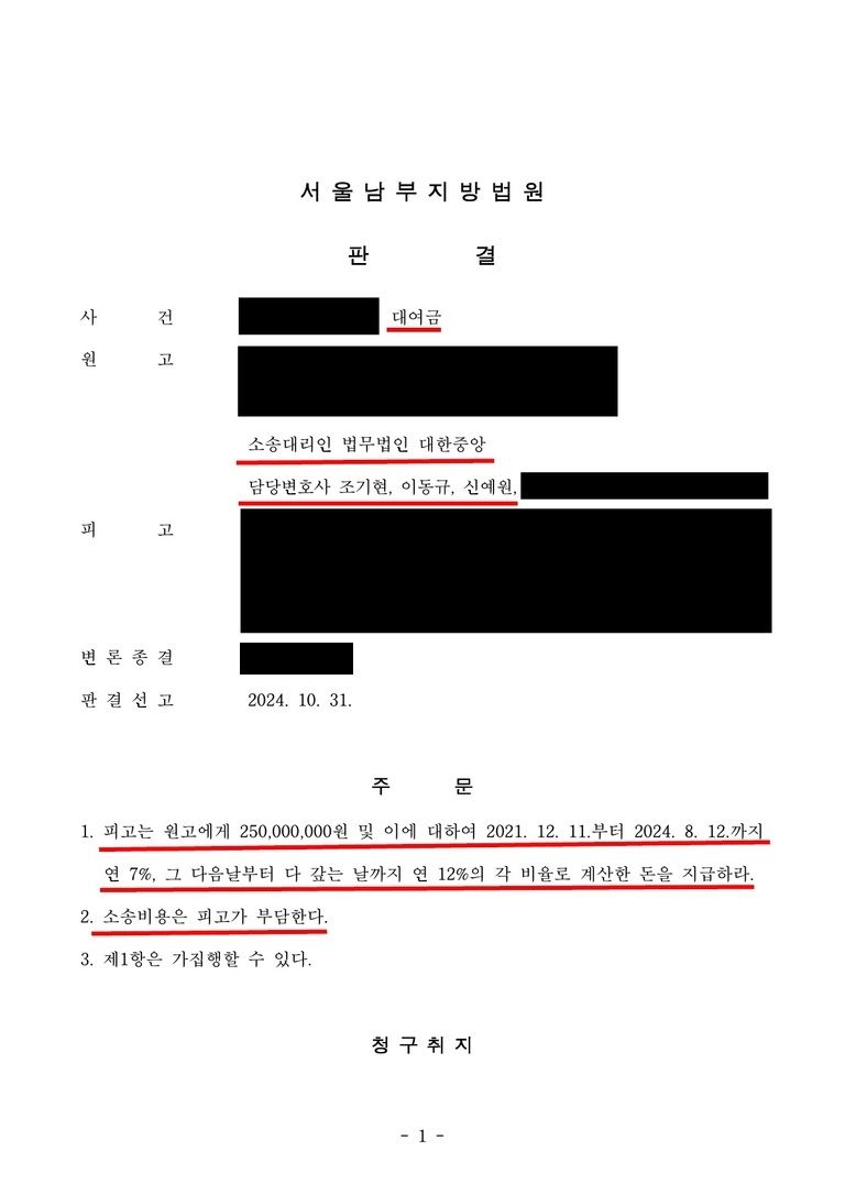 재판부는 이동규 변호사의 주장을 모두 인정하고 청구를 전부 인용하여 대여금 변제와 그 이자, 소송비용까지 모두 피고가 부담할 것을 명령하였습니다.