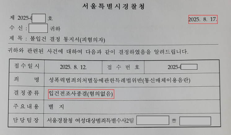 그리고 변호인의 의견이 받아들여져 위 사건에 대해 불입건, 즉 '입건 전 조사종결(혐의없음)' 처분으로 사건을 종결시킬 수 있었습니다.