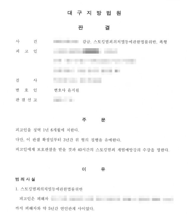 치열한 법정 공방 끝에, 재판부는 최종적으로 피고인에게 징역 1년 6개월을 선고하되, 그 형의 집행을 3년간 유예하는 판결을 내렸습니다. 이와 함께 보호관찰과 40시간의 스토킹 범죄 재범 예방 강의 수강을 명령했습니다. 이 판결 덕분에 의뢰인은 실형을 면하고 사회로 복귀하여 어머님을 계속 보살필 수 있는 기회를 얻게 되었습니다.