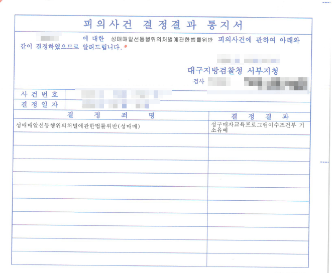 수개월에 걸친 치밀한 노력의 결과, 마침내 검찰청은 최종 결정을 내렸습니다. 공식적인 '피의사건 결정결과 통지서'에 명시된 결정 결과는 "성구매자교육프로그램이수조건부 기소유예"였습니다.
