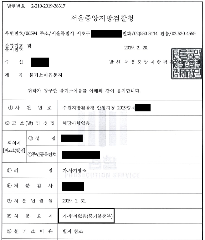 다행스럽게 의뢰인은 검찰 처분 이전 저희에게 사건을 맡기면서 무혐의로 종결지어 줄 것을 요청하였습니다.