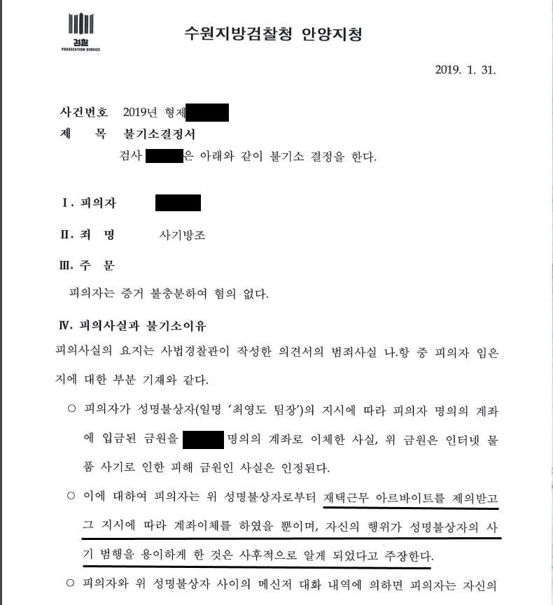 의뢰인은 보이스피싱 범죄자들의 기망에 따라 자신이 세금 감면을 위한 재택알바(재택 아르바이트)를 하는 줄로만 알고, 범죄자들의 보이스피싱 행위로 인하여 속은 피해자들로부터 송금받은 금원을 보이스피싱 범죄자들이 지정한 계좌로 옮기는 등의 방법으로 그들의 범죄에 연루되어 자칫 징역형까지 받을 상황에 처하게 되었습니다.