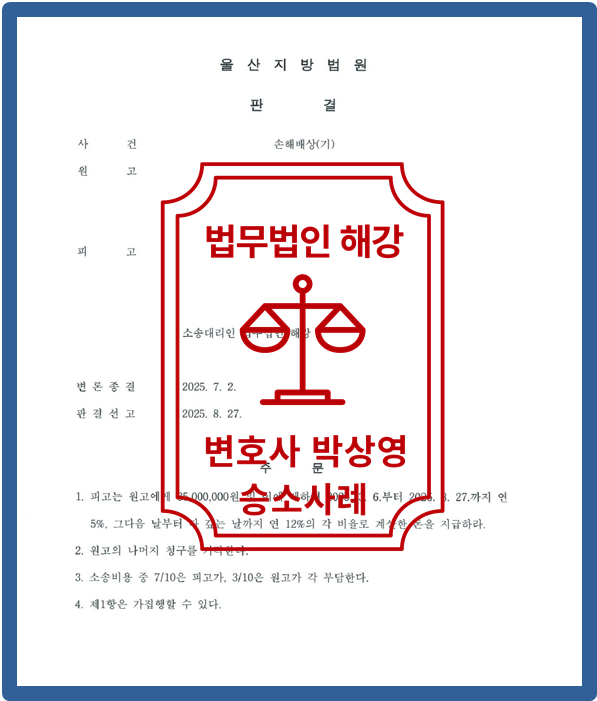 법무법인 해강에서는 법리적 검토와 준비서면 등을 통하여 의뢰인의 맞는 법률 조력을 하고자 노력하였고 이에 [성공] 하였습니다.