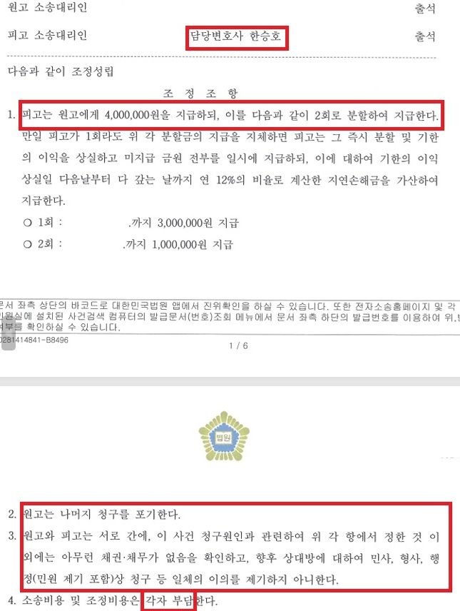 변호인은 조정절차에 출석하여, 여러 사건에서 합의를 이끌어낸 노하우를 통해 원고측과 원만히 합의를 이끌어 내어 원고의 청구금액인 "500만원에서 100만원을 감액한 400만원으로 하고, 의뢰인께서 납부하는데 부담이 없도록 그 방법은 2회 분할 납부 하기로 하였습니다. 또한 의뢰인과 원고 사이 성추행사건과 관련하여 더 이상의 법적인 청구나 이의를 제기하지 아니한다. 소송비용 및 조정비용은 각자 부담한다"는 내용으로 조정을 성립 시켰습니다.