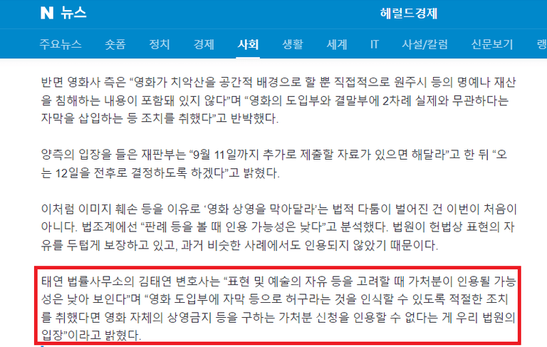 [가처분전문변호사 태연법률사무소 김태연 대표변호사님 영화상영금지가처분 관련 언론보도 소개]