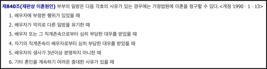 고부갈등으로 인한 이혼은 민법 제840조 제3호 "배우자 또는 그 직계존속으로부터 심히 부당한 대우를 받았을 때"에 해당됩니다.