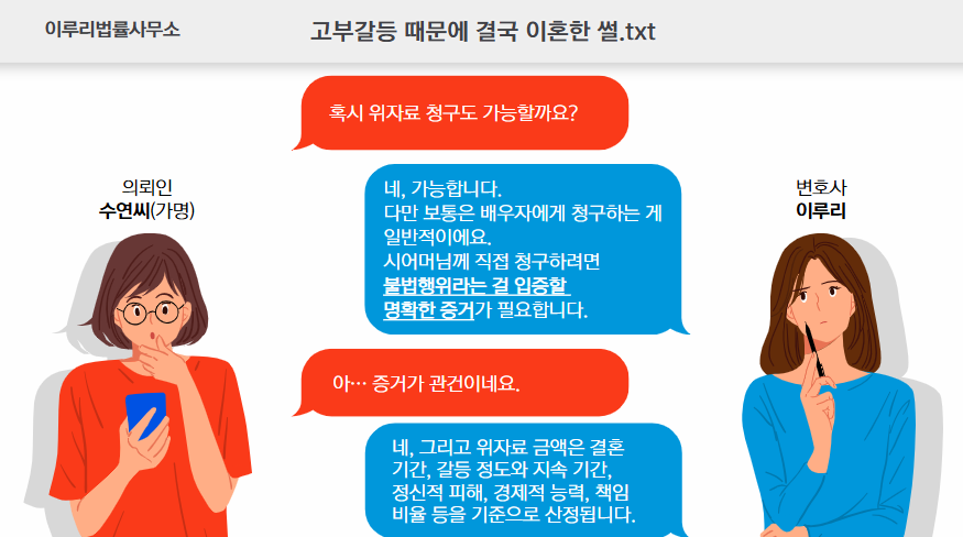 다만 위자료는 주로 배우자에게 청구하는 것이 일반적이며, 시어머니에게 직접 청구하기 위해서는 불법행위에 해당하는 명확한 증거가 필요합니다.