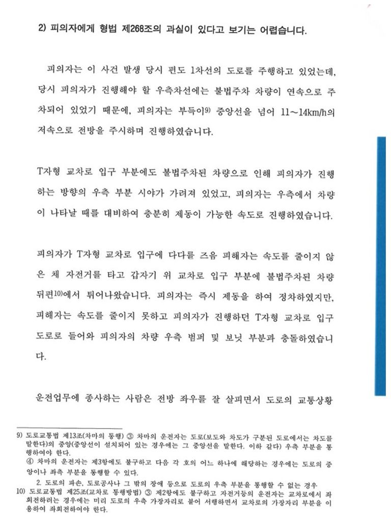 도로교봉법 제25조 제1항에는 '모든 차의 운전자는 교차로에서 우회전을 하려는 경우에는 미리 도로의 우측 가장자리를 서행하면서 우회전하여야 한다. 이 경우 우회전하는 차의 운전자는 신호에 따라 정지하거나 진행하는 보행자 또는 자전거등에 주의하여야 한다'라고 규정하고 있습니다. 의뢰인은 티자형 교차로에서 우회전을 하려 하였는데, 불법주차로 우측 가장자리를 사용할 수 없는 상황(도로교통법상 가능)에서, 돌발상황 발생시 즉시 정차가 가능할 정도인 11~14킬로로 서행하고 있었고, 전방주시의무도 충실히 이행하였습니다.