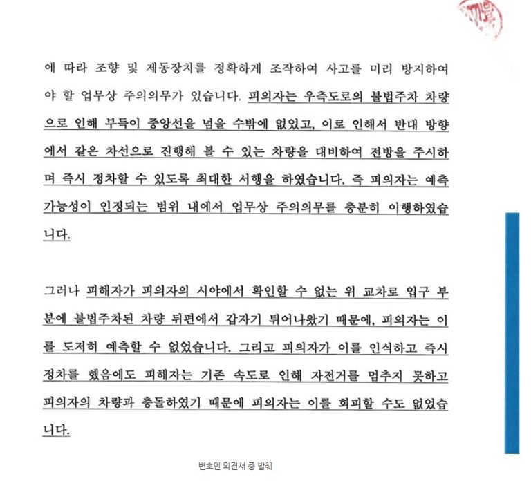 반면, 도로교통법 제25조 제3항에는 '자전거 등의 운전자는 교차로에서 좌회전하려는 경우에는 미리 도로의 우측 가장자리로 붙어 서행하면서 교차로의 가장자리 부분을 이용하여 좌회전하여야 한다'라고 규정되어 있음에도, 8살 피해자는 속도를 전혀 줄이지 않은 채 불법주차 차량 뒷편에서 튀어나왔고, 의뢰인이 손도 쓰지 못할 정도로 순식간에 차량 앞 범퍼에 충돌하였습니다. 즉 오히려 피해자 측에서 도로교통법을 위반하였고, 의뢰인으로서는 도로교통법을 어긴 피해자의 자전거가 불법차량 뒷편에서 튀어 나올 것을 예견할 수 없는 상황이었습니다.