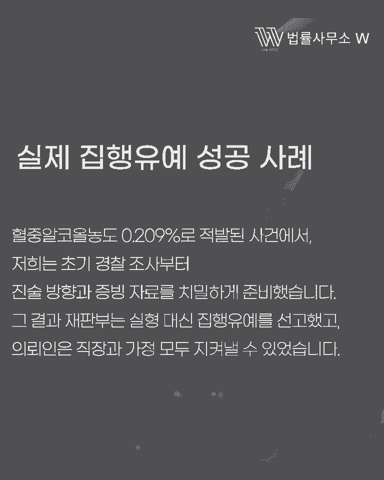 실제로 한 의뢰인은 혈중알코올농도 0.209%로 적발되었습니다. 과거 전력도 있어 실형 가능성이 높았던 사건이었습니다. 하지만 저희는 단속 경위, 운전 거리, 직장과 생계 상황, 재발 방지 계획을 종합적으로 정리했습니다.