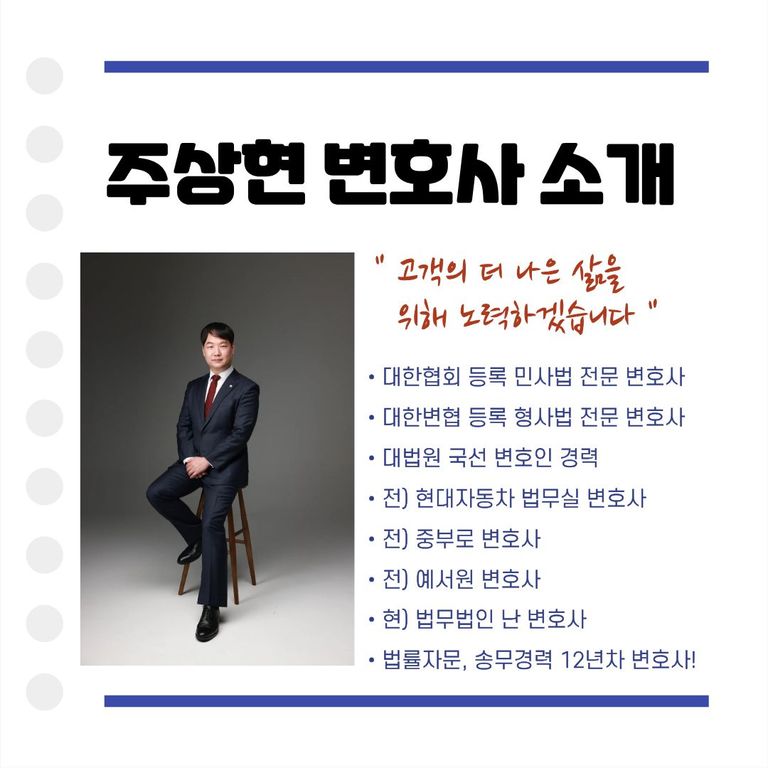 주상현 변호사는 민사 전문 변호사입니다. 민사소송 관련하여 수임 상담이 필요하시면 언제라도 연락 주시기 바랍니다. 로톡 상담 신청 및 네이버 검색 등을 활용해서 연락주시기 바랍니다.