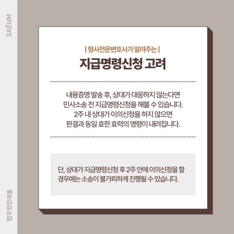 내용증명을 발송하였는데도 상대가 아무런 반응을 보이지 않는다면 법적 조치를 고려해야 하는데요. 민사소송 전에 가능한 방법이 바로 지급명령신청입니다. 해당 절차는 민사소송법 제462조에 따라 성립하는 것으로, 채권자의 일방적인 주장에 근거하여 법원이 채무자에게 변제를 명령하는 절차를 말합니다. 별도의 변론 절차 없이 곧바로 판결을 받을 수 있기 때문에 매우 신속한 간이제도입니다.