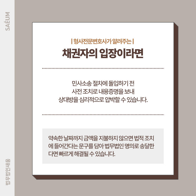 만일 첫 번째 채권자의 입장이라면 우선 민사 절차에 돌입하기 전 사전 조치를 취해야 하는데요. 바로 내용증명입니다.