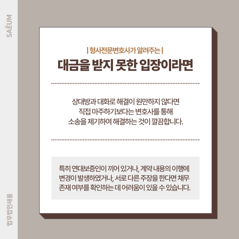 만일 자신이 대금을 받지 못한 입장이라면 무척 억울하고 화가 날 텐데요. 계속 찾아가 돈을 달라고 해도 발뺌하는 경우가 대부분입니다. 상대와 대화가 되지 않는다면 직접 마주하기보다는 법률 전문가를 통해 소송을 제기하여 해결하는 것이 깔끔합니다.