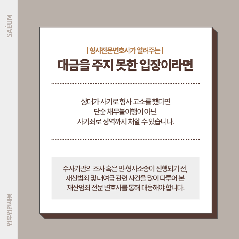 반대로 내가 피치 못할 사정으로 주지 못한 것인데 상대가 사기꾼이라며 형사고소를 했다면 이 또한 억울한 일일 것입니다. 단순 채무불이행이 아닌 사기죄가 적용되면 징역까지 처할 수 있습니다.