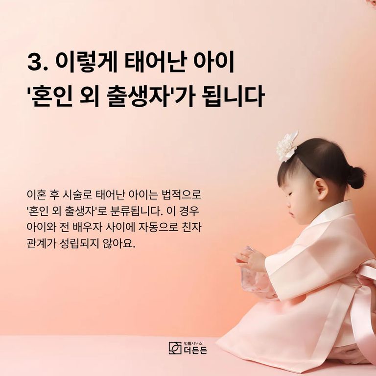 민법상 혼인 외의 상태에서 태어난 아이는 '혼인 외 출생자'로 분류됩니다. 이는 배우자 간 혼인 관계가 해소된 후의 임신이므로, 전 배우자와 자녀 사이에 법적인 친자 관계가 자동으로 성립되지 않습니다.