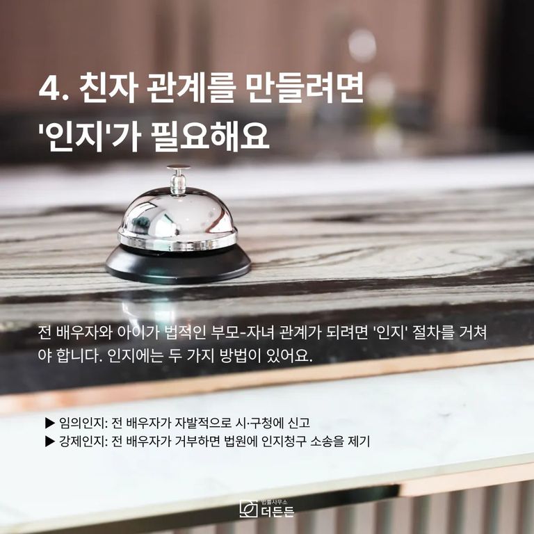 따라서 아이와 생부(전 배우자) 사이에 법적인 관계를 맺으려면 '인지(認知)' 절차를 거쳐야 합니다. 인지란 혼인 외의 출생자에 대해 그 생부가 자신의 친생자로 인정하는 행위를 말합니다.