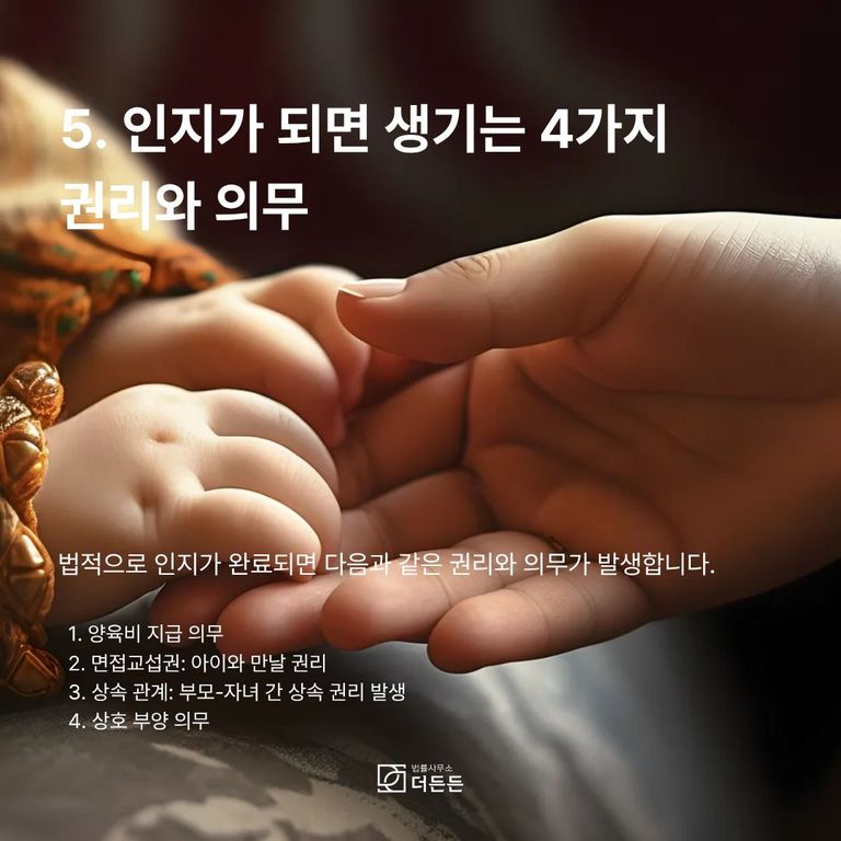 인지 절차를 통해 법적인 친자 관계가 성립되면, 다음과 같은 권리와 의무가 상호 간에 발생합니다.