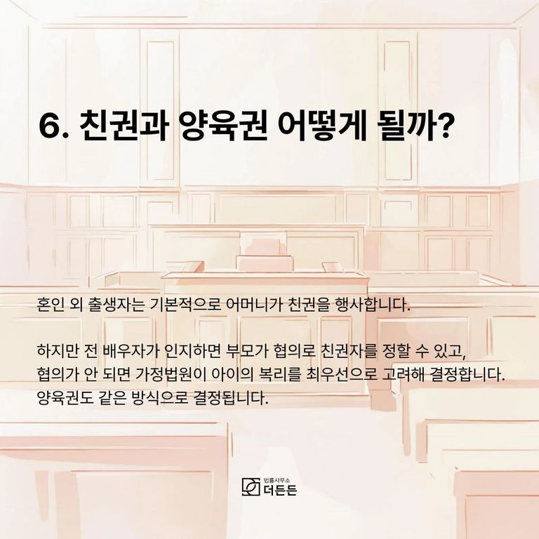 혼인 외 출생자의 경우, 친권은 기본적으로 어머니에게 있습니다. 그러나 인지 후에는 부모의 협의로 친권자를 정할 수 있습니다. 만약 협의가 되지 않으면 가정법원이 '자녀의 복리'를 최우선으로 고려하여 친권자를 지정하게 됩니다. 양육권 역시 마찬가지로, 어머니가 기본적으로 양육권을 가지지만, 아버지가 양육권을 주장할 경우 법원이 자녀의 최선의 이익을 고려하여 결정하게 됩니다.