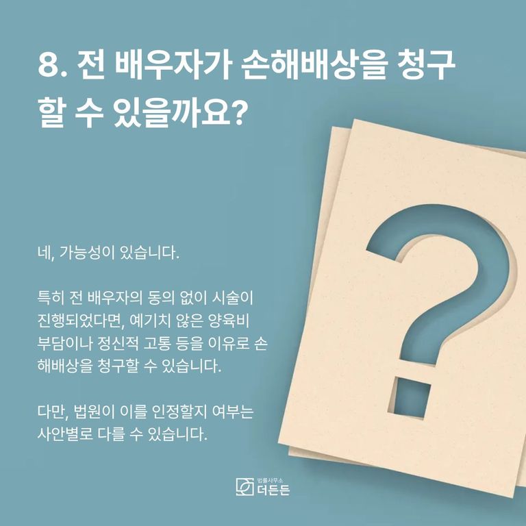 이 경우, 예상치 못한 양육비 부담이나 정신적 고통 등을 이유로 전 배우자가 손해배상을 청구할 가능성도 있습니다. 법원이 이를 얼마나 인정할지는 사안의 구체적인 사실관계에 따라 달라질 수 있습니다.