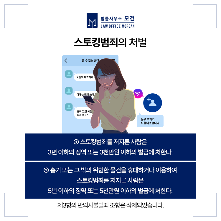 그런데 현행 스토킹처벌법에서 정하고 있는 스토킹행위는 범위가 매우 넓고 적용기준이 애매한 부분이 있어 무분별한 고소로 이어질 수 있는 측면도 있어 주의가 필요합니다.