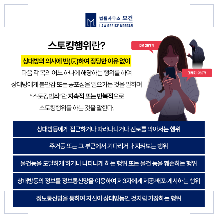 이때 스토킹행위에 해당되려면 상대방의 의사에 반하여, 정당한 이유없이, 스토킹처벌법 제2조 제1호 각 목에 해당하는 행위를 하고, 그로인해 상대방이 불안감 또는 공포심을 일으켰음이 입증되어야 합니다.