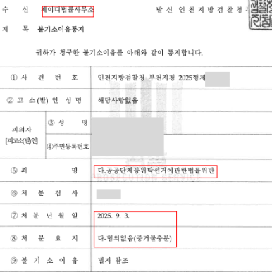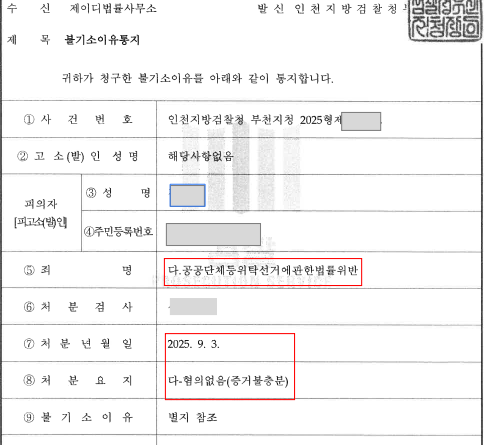 2025. 9. 3. 경찰에서 송치한 공공단체등위탁선거에관한법률위반 2건에 대해 검찰에서 각각 혐의없음(증거불충분) 한 성공사례가 있어 이를 공유하고자 합니다.