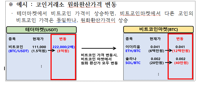많은 거래소는 비트코인(BTC)이나 테더(USDT)로 다른 코인을 거래하는 마켓을 운영합니다. 이때 투자자 편의를 위해 '원화 환산 가격'을 보여주죠. 혐의자는 바로 이 점을 노렸습니다.