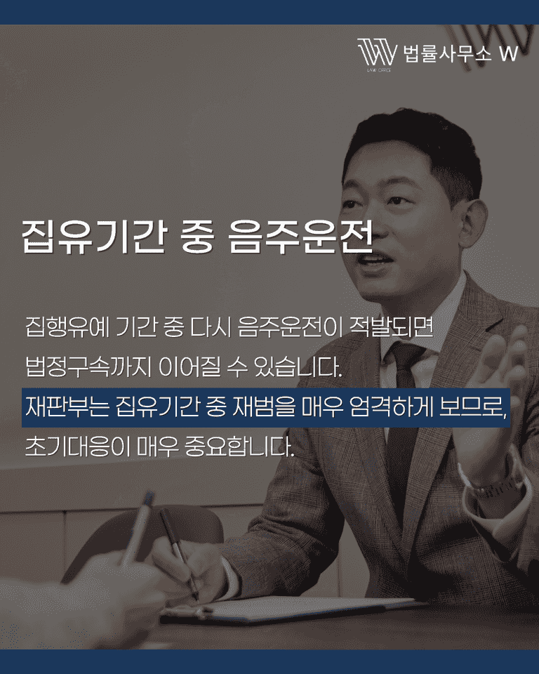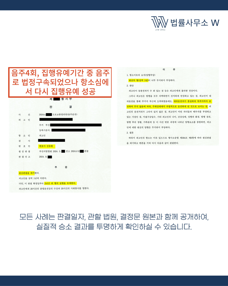 집유기간 중 재범은 가장 불리한 상황이지만, 철저한 준비와 변론 전략으로 결과를 바꿀 수 있습니다. 법률사무소 W는 부산에서 다수의 음주운전 사건을 수행하며 항소심에서 집행유예를 다시 받아낸 경험이 있습니다.