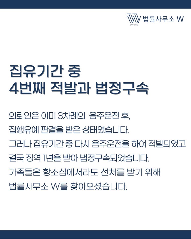 의뢰인은 이미 3차례의 전력이 있었고, 마지막 처벌에서도 집행유예 판결을 받은 상태였습니다. 그러나 집유기간 중 다시 음주운전을 하여 4번째 적발이 되었고, 결국 1심에서 징역 1년을 선고받아 법정구속되었습니다.